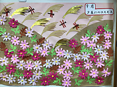 8月のおけいこ作品の紹介です。 ご利用者様の9月の貼り絵の共同作品「夕暮れのコス...